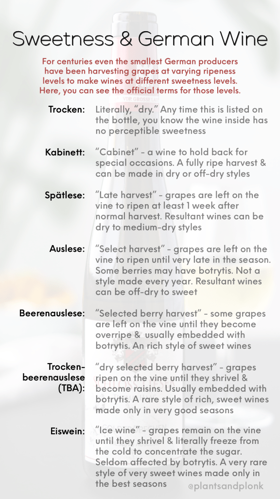 German wine labels and wine regulations are notorious for being difficult to decipher. Even after living here over a year, I don’t understand everything! Auslese is the third degree of ripeness in the German Prädikat wine qualification system (see the note below on sweetness in German wine for more information). Remember, the longer grapes are left on the vine, the riper they get and the more sugar they have. When yeasts ferment sweeter grape juice, they often die off before consuming all of the grape sugar. Thus more of that fruit sugar is left in the final wine (and is known as “residual sugar”).