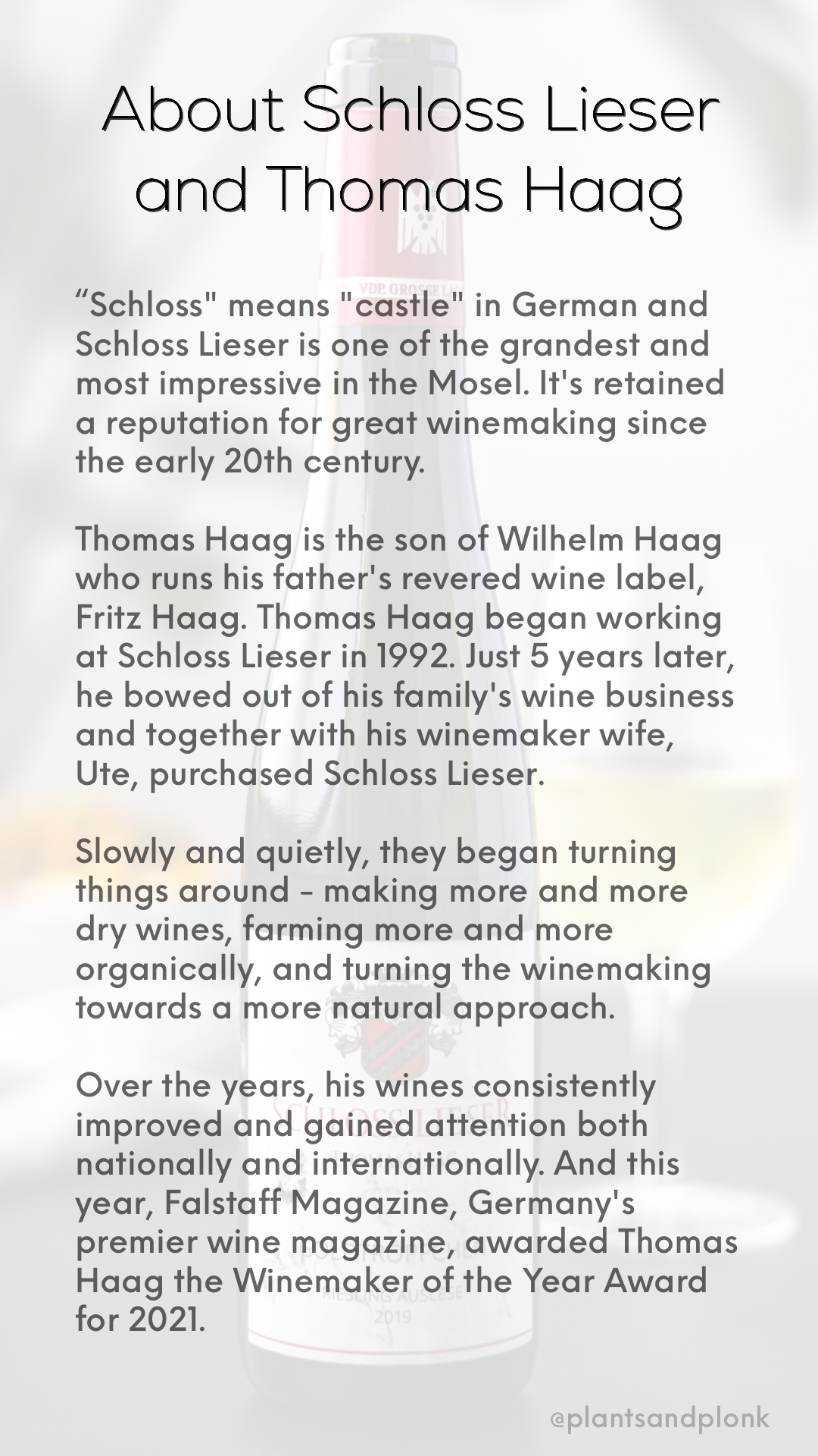 This wine was made with those overripe grapes – and Thomas Haag knocked it out of the park. Sweeter wines can be difficult to make because the more sugar that accumulates in the grape through ripening, the less acidity it will have. So, sweet wines are naturally less acidic, and therefore at risk of being saccharine or cloyingly sweet. But careful winemakers like Thomas Haag work hard in the vineyard and in the cellar to ensure their wines have the right balance. Read more about this talented producer in the note below.