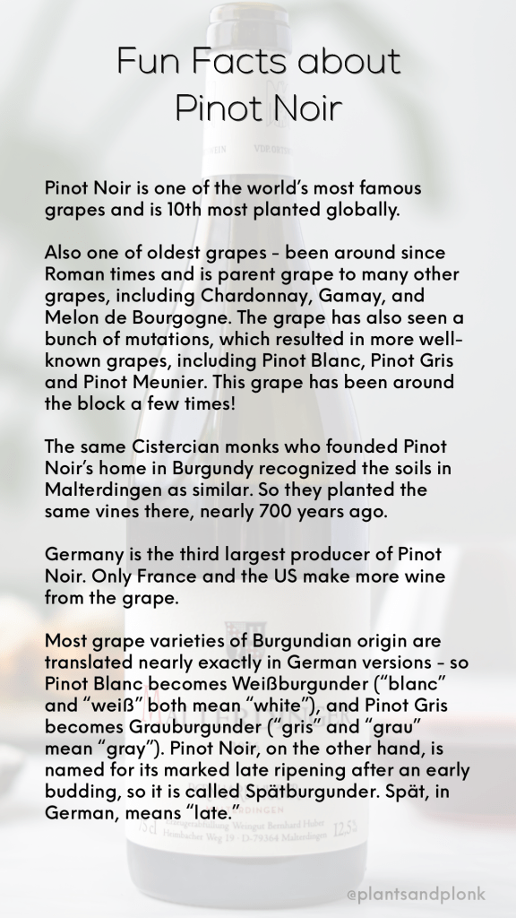 In Germany, Pinot Noir is called Spätburgunder (SHPATE-bur-guhn-deh). “Spät” means “late” in German, a nod to the grape’s late ripening characteristics. “Burgunder” means “from Burgundy,” which make sense since that’s Pinot Noir’s native home. (More fun facts about Pinot Noir below.)