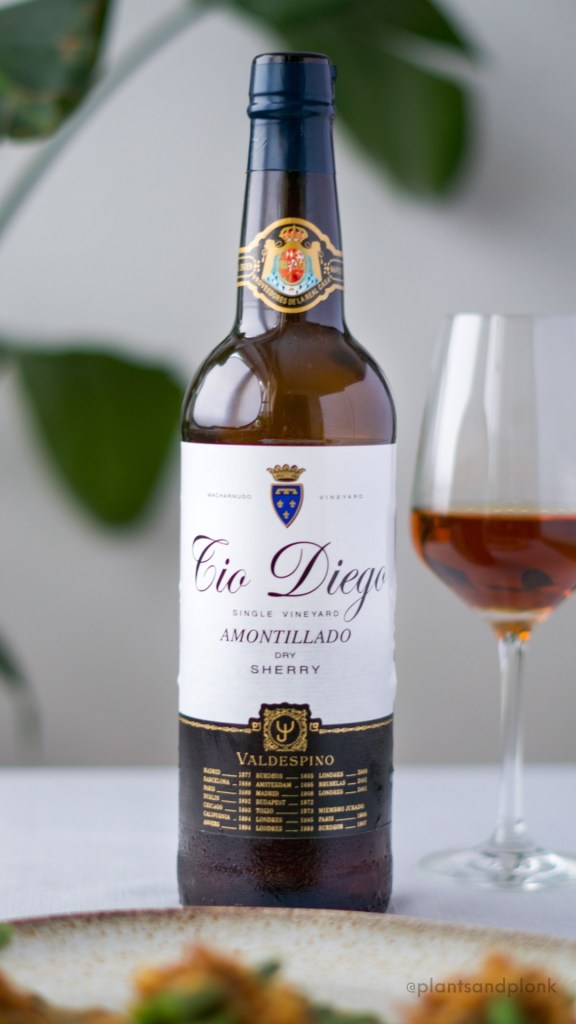 This week’s wine is an amontillado sherry. That means the wine spent part of its life deprived of oxygen and part deliberately exposed to oxygen. It’s dry, as are most in this category (and most sherries, contrary to popular belief). But Tio Diego is particularly cool because the grapes used to make it come from a single vineyard, which is very rare in the land where everything is blended.