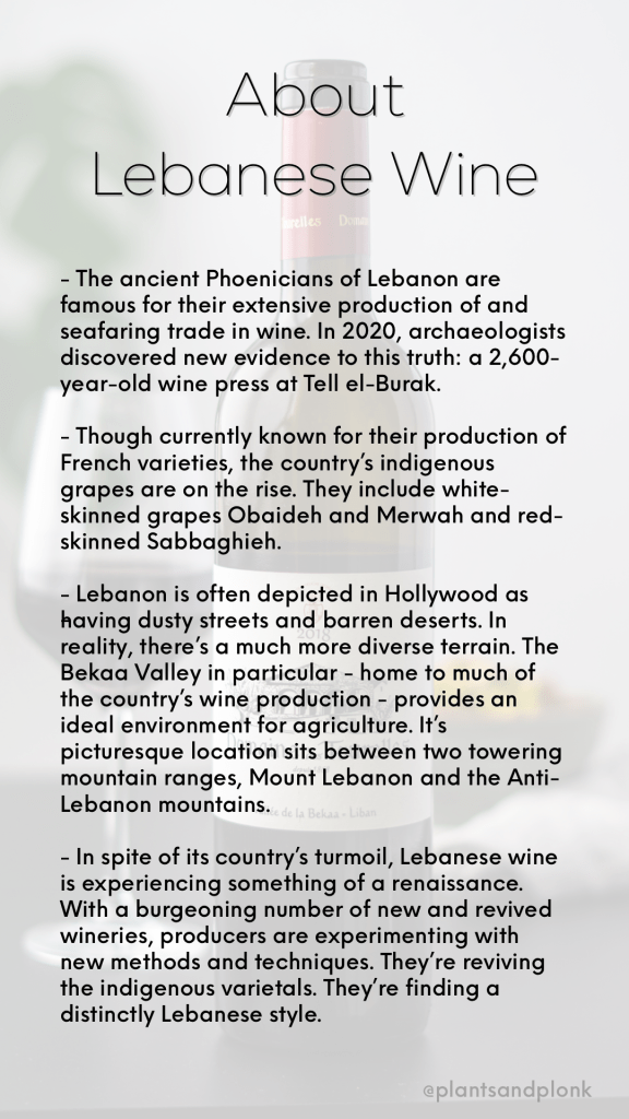 This week’s wine is from ::drumroll:: Lebanon! Despite Lebanon having one of the longest histories of winemaking (thanks, Phoenicians!), the existence and quality of Lebanese wines often surprise the average consumer. Maybe that’s because we’re more likely to read headlines about the country’s political and economic turmoil than about its winemaking renaissance. But those wines definitely deserve a spot in the limelight, too. Lebanese wine production has been making quite the comeback since the 1990s and today, Lebanese wines offer a fresh start for reframing the one-dimensional, outdated depictions of the country we get from the media. Check out the info box below for a few more details, or read this Eater article by Lebanese-American wine writer, Farrah Berrou, to dig in deeper.