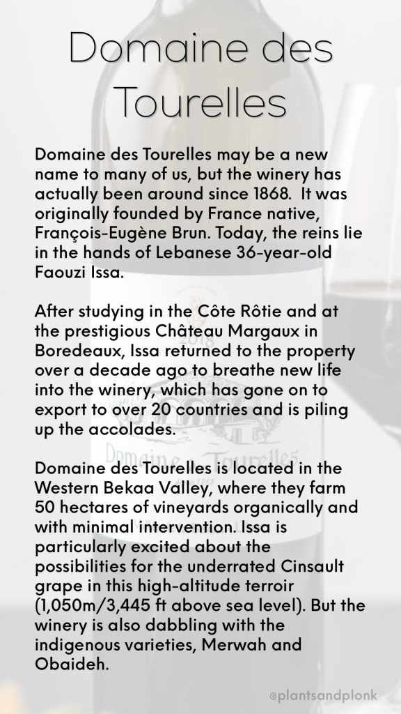 If you have heard of Lebanese wine, it’s likely from the best known producer, Chateau Musar, famous for transporting their grapes across the frontlines even through active conflict. But there are several other rocks stars making in-roads slowly and steadily. This week’s wine is by Domaine des Tourelles (find out more below) and is a blend of mostly Cabernet Sauvignon and Syrah (in equal parts) with a bit of Cinsault and Carignan blended in. It’s earthy, savory aspects are balanced out by the dark, juicy fruit characteristics (full tasting notes below). I was surprised to find the wine doesn’t spend any time in oak, because there’s definitely a smokey, ashy quality to it. And the mineral undertones make it quite complex for a 15€ wine. Definitely a bargain.