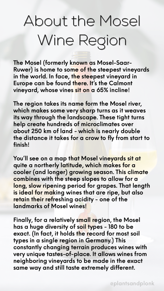 This week’s wine is particularly exciting since it’s from the Mosel – the land that in many ways set the mold for elegant, aromatic, acid-driven German rieslings. This skin-contact wine comprised of two lesser-valued grapes eeks a few cracks into that mold (if it doesn’t break it completely). Check out the info box below for what makes this Mosel region of Germany so special.