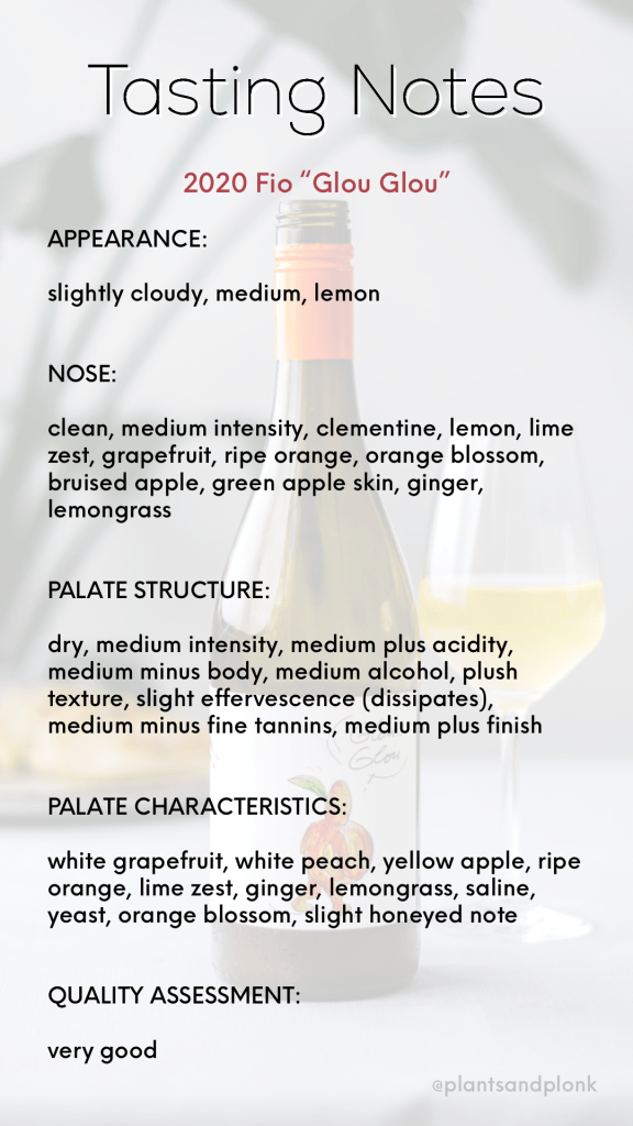 For a wine named “Glou glou” (meaning “glug glug” – the European equivalent of a chuggable patio crusher), it’s brimming with complexity. One after another, the wine presents fruit, floral, herbal, yeast and saline flavors, hinting all the while at an umami undertone I can’t quite place. (Find my full tasting notes below.) Structurally, this is a very well integrated wine – sometimes a wine’s acidity, tannins or alcohol feel out of sync with its flavors. Not true for this one, whose notes combine in near perfect harmony. Plus those juicy flavors linger on the palate as if suspended in the air in your mouth. No wonder it was dubbed “glou glou”!