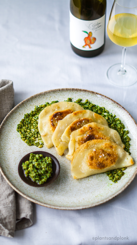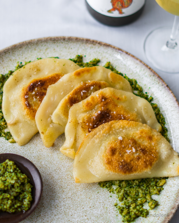 At this point, you can freeze any of the pierogis for a future date or sauté them immediately in a skillet with a little vegan butter. Finish them off with some flaked finishing salt and eat as is or serve with some more of the pesto, some vegan sour cream and/or a glass of German orange wine!